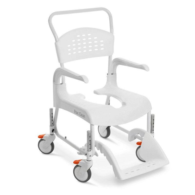 Assise avec découpe intime vers l'arrièreAccoudoirs amovibles et relevables facilitant le transfert latéralDossier avec poignée facilitant son déplacementAvec repose pieds monobloc réglable et amoviblePlusieurs hauteurs d'assise au choixPoids maximal supporté : 130 kg