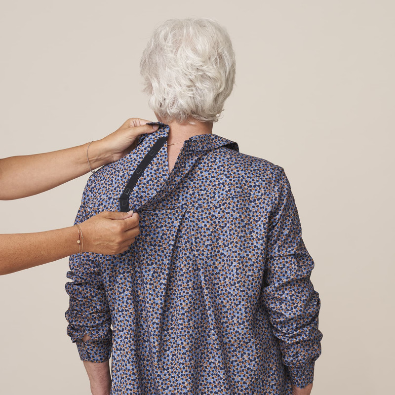 Ouverture arrière. Plus simple pour l'aidant. Systèmes à aimants. Tissu souple et agréable. Liberté de mouvements. Coupe adaptée aux seniors. Fabriqué en France.
