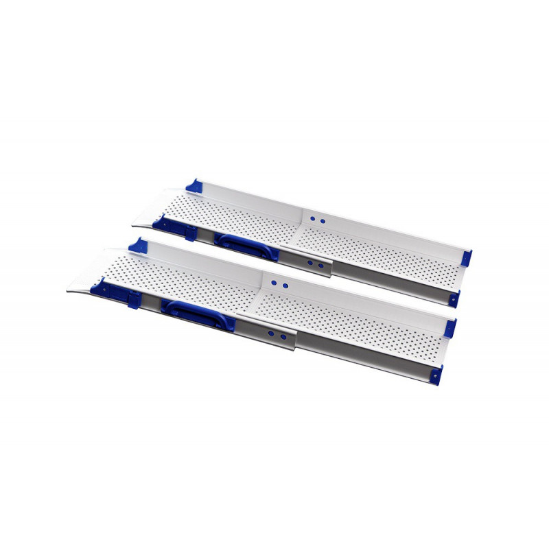 Paire de rampes d'accès télescopiques en aluminium avec surface antidérapante pour un maximum de sécurité. Disponible en petits modèles (de 58 cm à 119 cm) ou grands modèles (de 116 cm à 288 cm). En 2 ou 3 parties téléscopiques . Les rampes petits modèles sont plus adaptées pour monter un fauteuil, une moto, un scooter dans le coffre d'une voiture, les rampes grands modèles pour un passage d'obstacle.