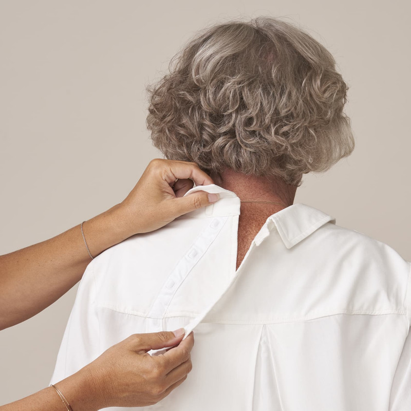 Ouverture arrière. Plus simple pour l'aidant. Systèmes à aimants. Tissu souple et agréable. Liberté de mouvements. Coupe adaptée aux seniors. Fabriqué en France.