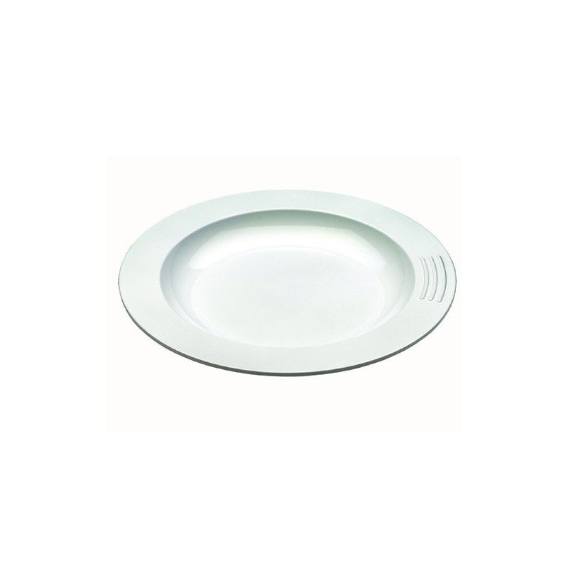 Assiette demi creuse avec surface grainée anti-rayures. Idéale pour un usage intensif en collectivité. Les assiettes passent au micro-ondes et au lave-vaisselle. Sans bisphénol A. Fabrication française.