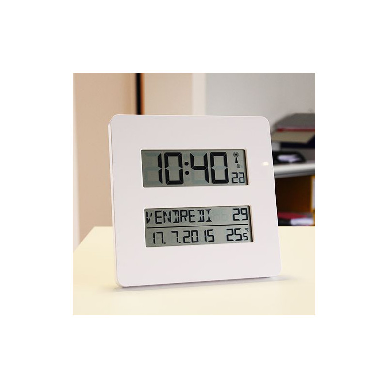 Idéale pour les personnes désorientées, cette horloge de grande taille permet aux personnes âgées de se repérer dans le temps avec plus de facilité. Radio-pilotée : l'horloge met l'heure à jour automatiquement par fréquence radio. Un premier cadran supérieur indique l'heure avec de gros caractèresUn second cadran inférieur affiche la semaine du calendrier, le jour, la date, le mois, l'année la température. 7 langues disponibles (Néerlandais, Anglais, Français, Allemand, Espagnol, Italien et Danois) . Fixation au mur possible par encoche. Taille de l'horloge : 19. 5 x 19. 5 x 2. 7 cm