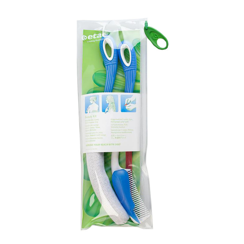 Kit composé d'un peigne, d'une brosse à laver le corps et d'une poignée multi-usagesLes éléments disposent de poignées à long mancheGrande aide pour éviter les contorsions