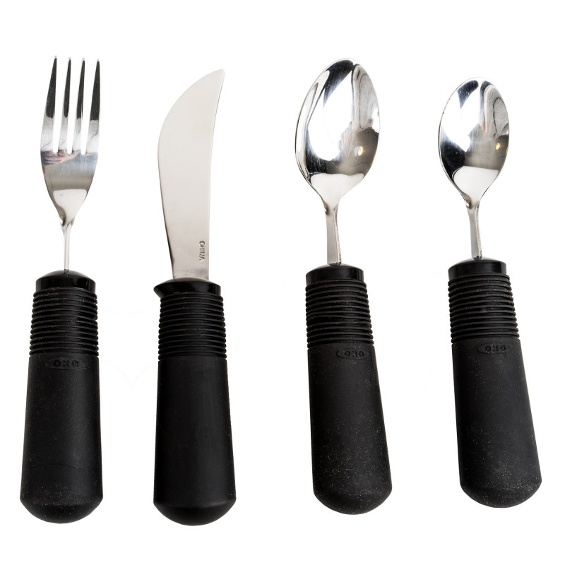 Lot de 4 couverts ergonomiques (fourchette, couteau, petite cuillère, cuillère à soupe). Lestés pour limiter les tremblements. Facilement inclinables. Offrent une meilleure préhension. Manches en caoutchouc. Attention : ce set comporte 4 couverts