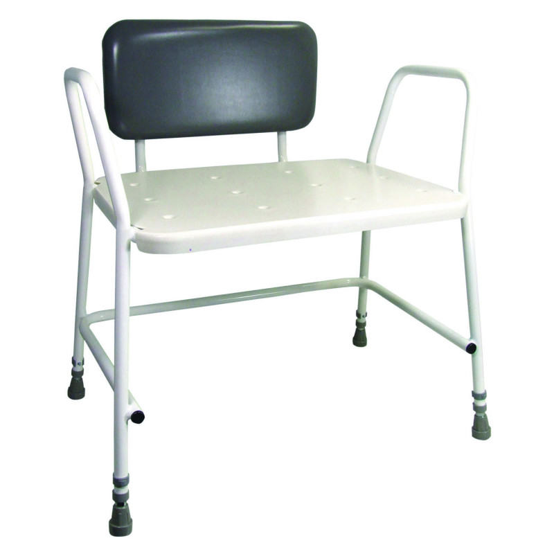 Tabouret de douche pour les personnes qui ont des difficultés à se tenir deboutRéglable en hauteurDossier rembourréAccoudoirs latérauxAssise à clipserPoids max. supporté : 254 kg