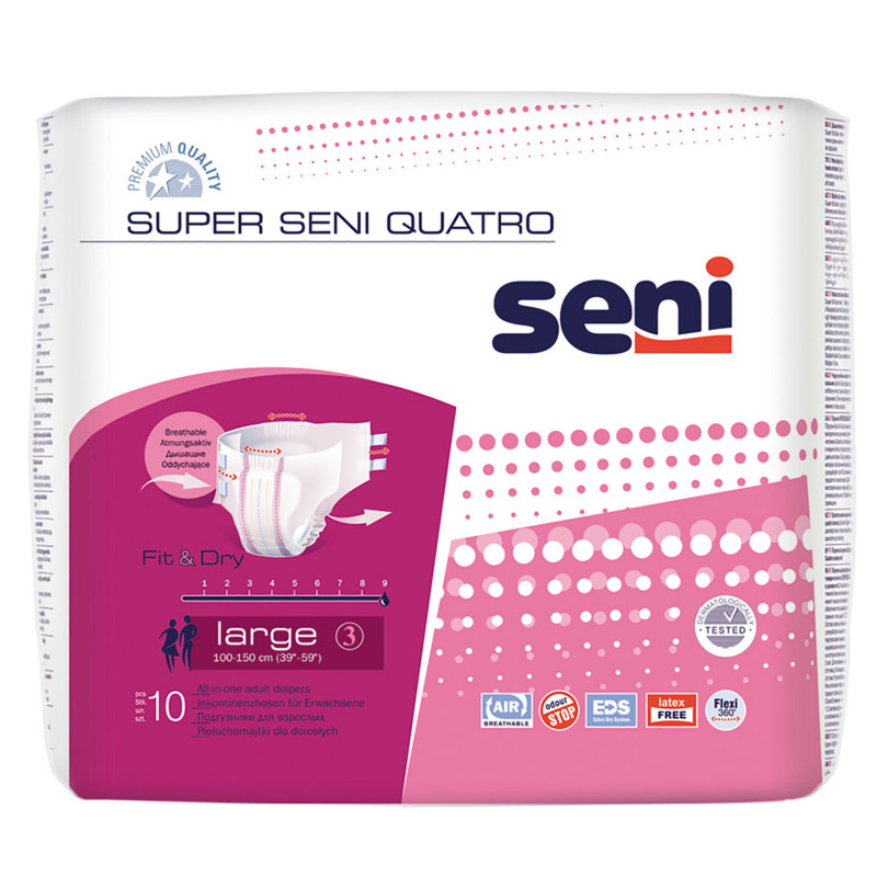 Fuites urinaires modérées à fortesTaille : LTour de taille : 100-150 cmAbsorption : 4000 mlPoids : 178 gPièces par sachet : 10Prix par pièce : 1,19€