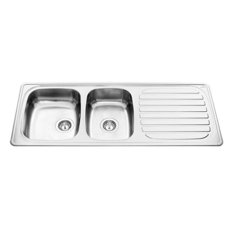 Le plus grand évier de la gamme des éviers PMR. Dimensions : largeur 120,6 cm x 49,6 cm. 2 cuves peu profondes (hauteur : 12 cm). En inox.