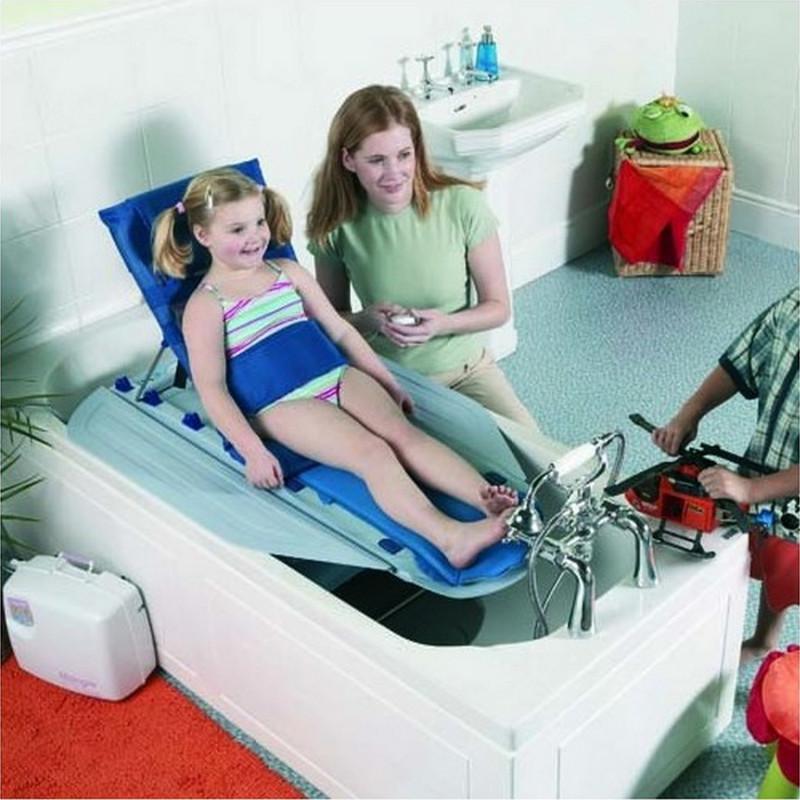 Élévateur de bain avec châssis, compresseur et coussin gonflable. Descend au fond de la baignoire, l'enfant est immergé et profite du confort et de la chaleur du bain. Dossier 4 positions, couché à assis droit pour une souplesse maximale. Utilisation simple, mise en place aisée dans la baignoire et nettoyage rapide. Prise en charge PCH.