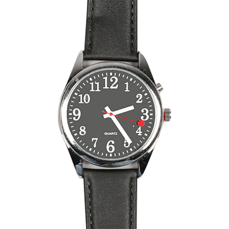 Montre parlante pour homme. Annonce vocale de l'heure et des minutes. Simple d'utilisation avec un seul bouton. Pas de fonction alarme. Diamètre du cadran : 4. 3 cm.