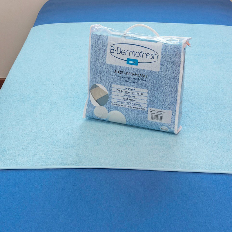 Silencieuse, imperméable et respiranteTissu 100% coton bouclé, double faceDouble face laminé avec un film de polyuréthaneAbsorption : 300 mlTaille : 150 x 100 cmDisponible en blanc ou bleu