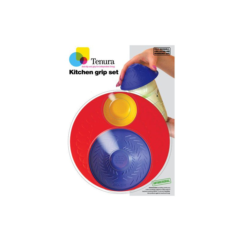 1 Ouvre bouteille antidérapant. 1 Ouvre bocaux antidérapant. 1 Set de table antidérapant. Trois coloris disponibles.