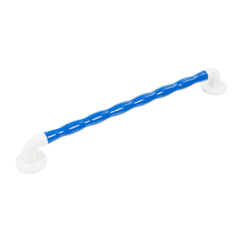 Barre de maintien à poignée ergonomique en plastique et renforcée par une partie centrale tubulaire en acier inoxydable. La forme en vague de son tube améliore la préhension. Disponible en 2 couleurs : blanc et bleu (malvoyant). Disponible en 3 longueurs : 30, 45 et 60 cm.