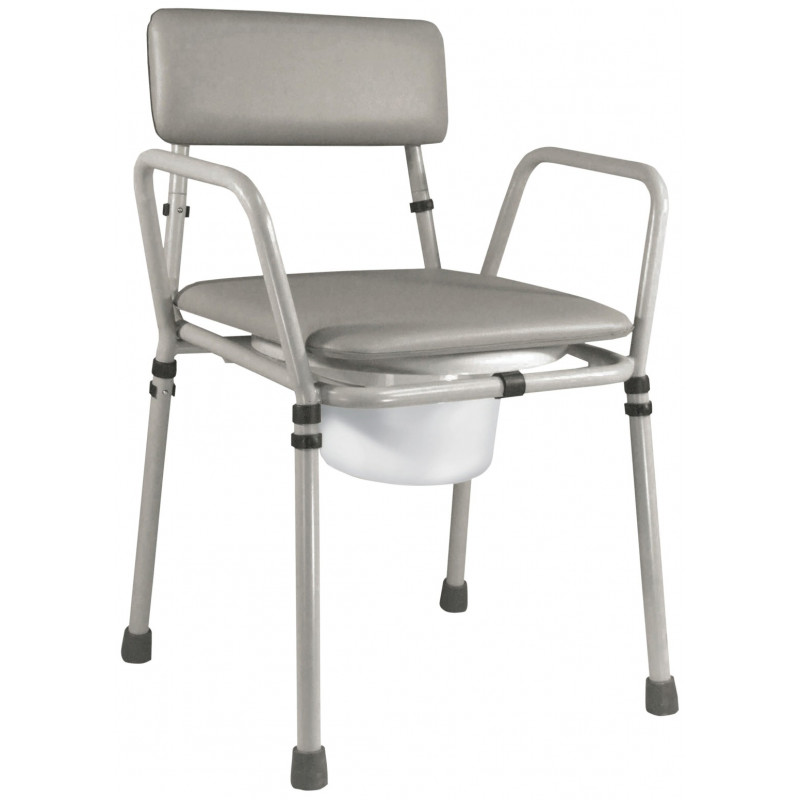 Pratique car légère, réglable en hauteur, empilable et même démontable. S'utilise comme chaise percée dans la chambre et/ou la salle de bains. Assise rembourrée et soudée au vinyle afin de réduire le risque de bactéries. Seau amovible de 5 litres avec anse et couvercle. Poids max supporté : 150 ou 170 kg.