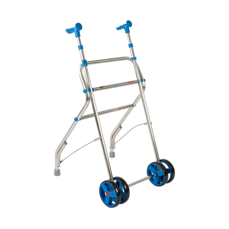 Déambulateur à 2 roues d'intérieur pliable pour adultes. En option : poignées en mousse, panier et tablette. Poids max. supporté : 150 kg. Poids : 2,2 kg.