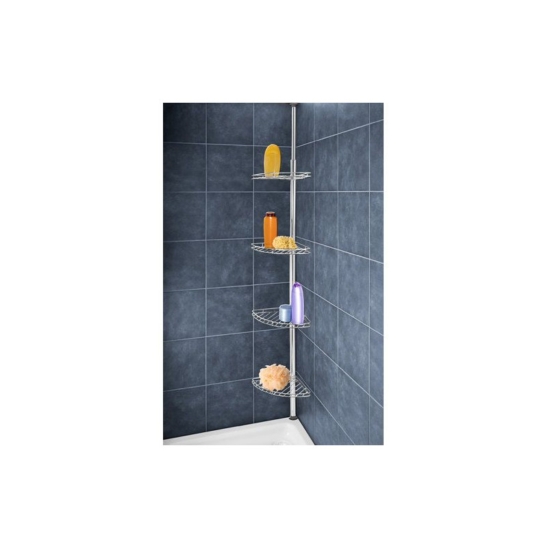Pour ranger éponges, gels douches, savons, brosses etc. 4 tablettes réglables en hauteur. Tige télescopique de 56 à 275 cm. Montage facile et rapide, sans outils ni perçage. Acier inox haut de gamme.