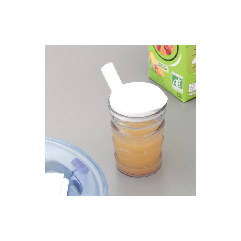 Tasse anti-renversement avec un bec à angle pour une utilisation plus simple. La forme de la tasse, avec ses cannelures, permet une meilleure prise en main.