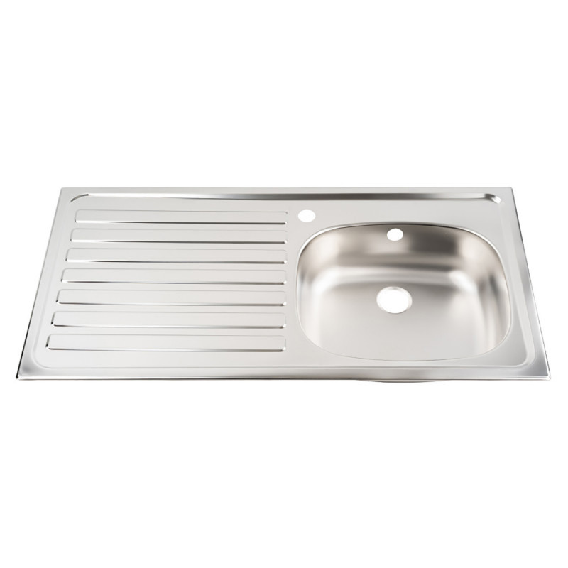 Éviers PMR 1 cuve + égouttoir. Dimensions : largeur 94 cm x 49 cm. 1 cuve peu profonde (hauteur : 12,7 cm). En inox. Égouttoir strié. A encastrer.