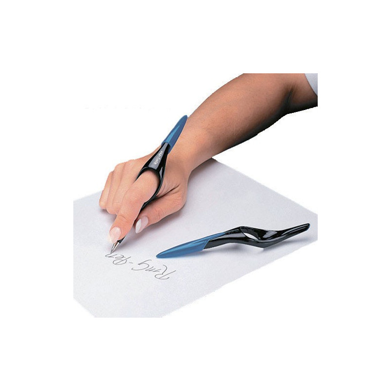 Évite les tremblements et les douleurs musculaires d'un stylo classique. Sa forme ergonomique laisse passer l'index au travers d'un anneau pour un maintien naturel. Fonctionne pour les droitiers et les gauchers. Vendu avec 2 recharges. Couleur encre : bleu.