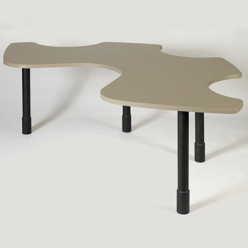Hauteur variable. Facilite l'installation en fauteuil roulant. Plateau stratifié épais. Profondeur importante pour éviter de se cogner sous la table.