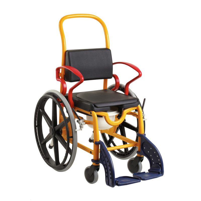 Roues 24" pour un déplacement autonome ou accompagné de l'enfant3 versions possibles : standard, avec siège réglable ou avec appui-tête réglable au choixAssise percée avec seau et découpe intime recouverte d'un coussin rembourré et confortableAccoudoirs relevables pour faciliter les transferts latérauxRepose-pieds escamotables sur les côtés, amovibles avec palettes relevables et réglables en hauteur