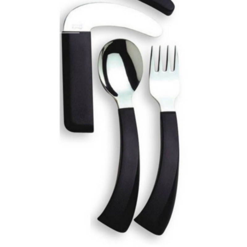 Lot composé d'une fourchette, d'une cuillère et d'un couteauFacilement préhensibleInclinéLongueur totale : 13-18 cm (selon le couvert)Pour gauchers ou droitiers (au choix)Poids : 230 gPasse au lave-vaisselle