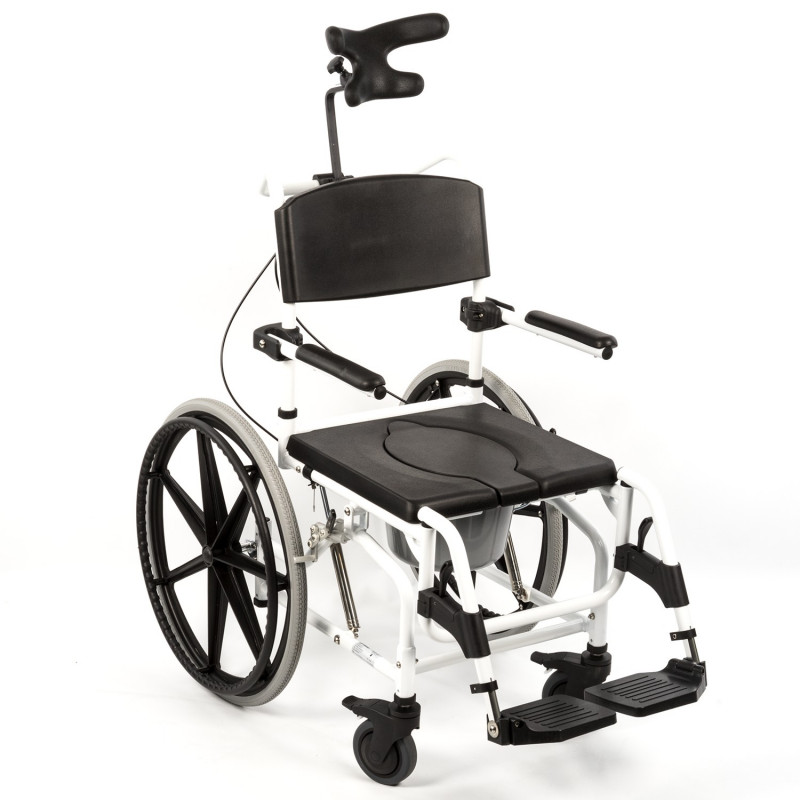 Propulsion avec roues 24"Assise percée avec coussin d'assise amovible et découpe intimeAccoudoirs relevables facilitant le transfert latéralAvec appui-tête confortable et réglablePoids maximal supporté : 140 kgPoids : 16 kgHauteur d'assise réglable : 54 à 59 cm