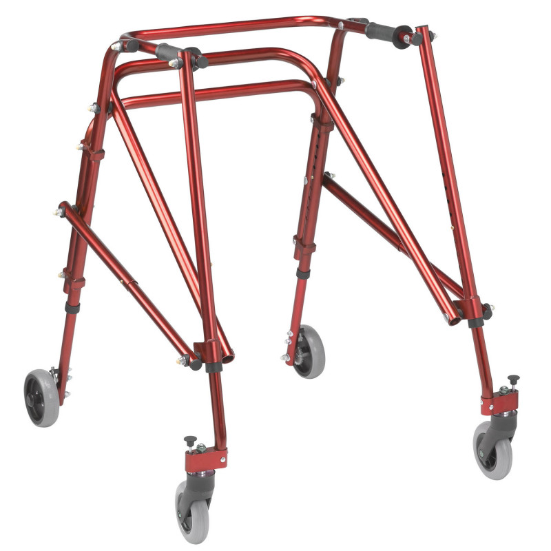 Cadre de marche particulièrement léger adapté aux enfants5 taillesFacile à manier grâce à ses roues pivotantes et antidérapantesPratique : ses roues ne marquent pas le solPoignées à rebords arrondis