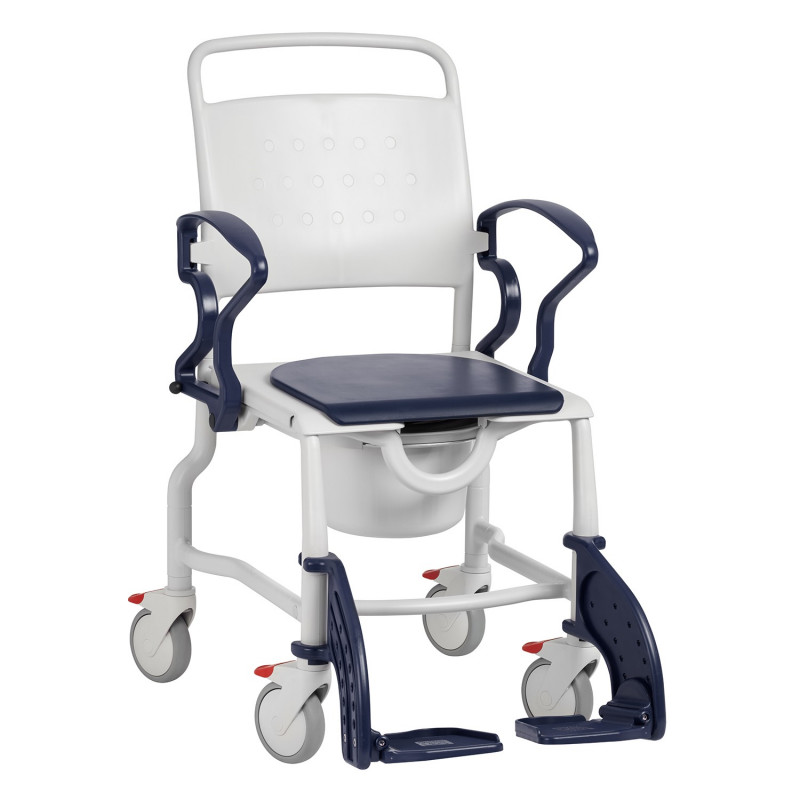 Assise carrée avec découpe intimeAccoudoirs rétractables facilitant le transfert latéralDossier avec poignée facilitant son déplacementAvec repose-piedsPoids maximal supporté : 130 kgPoids : 11,9 kgHauteur d'assise : 51 cm