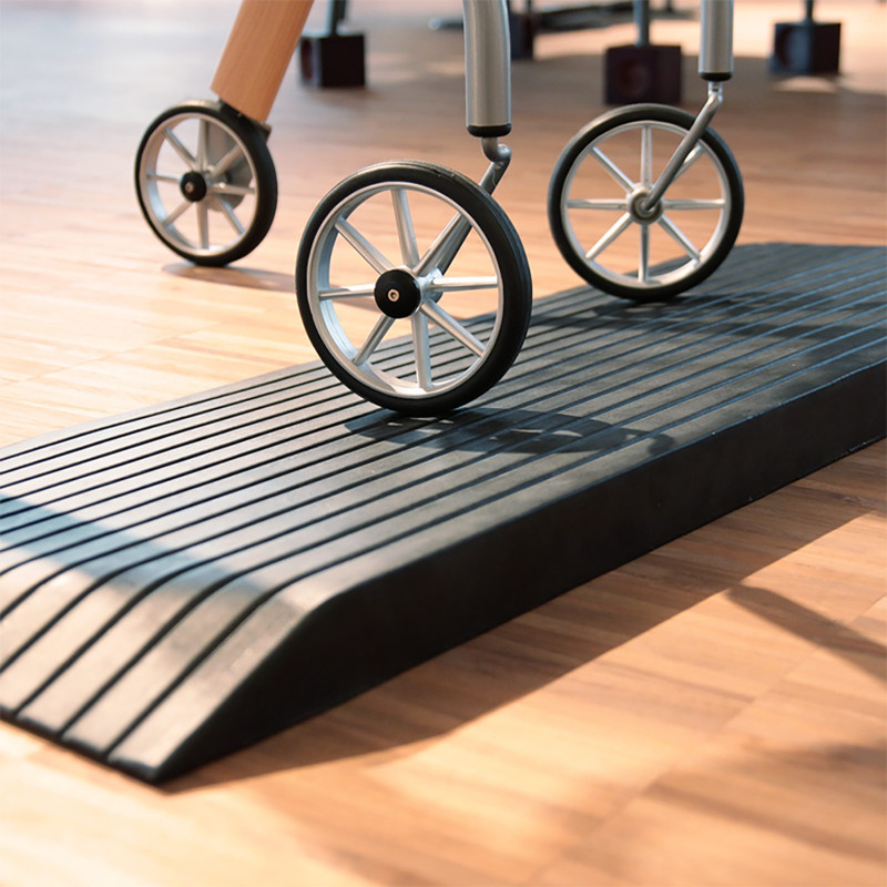 Rampe de seuil en caoutchouc pour les passages de seuil et porte-fenêtre jusqu'à 10 cm de hauteur. Choix parmi plusieurs hauteurs intermédiaires de 2,5 à 10 cm. Matière souple et découpable pour un ajustement adéquat à l'obstacle. Poids maximum supporté : 1000 kg. Formes angulaires sur les côtés.