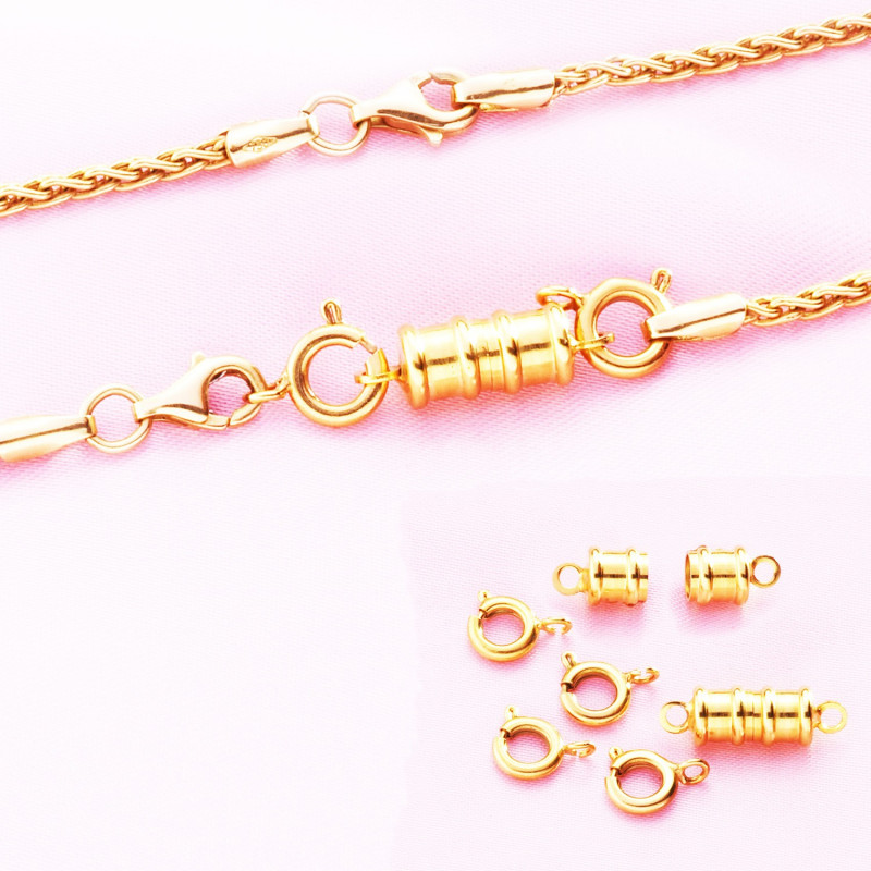 Mettre vos bijoux (colliers ou bracelets) ne sera plus une corvée grâce à ces fermoirs aimantés. Attachez simplement les deux parties aimantées du fermoir à chaque extrémité du bijou. Comprend 2 paires d'aimants et 4 mousquetons. Disponible en finition dorée.
