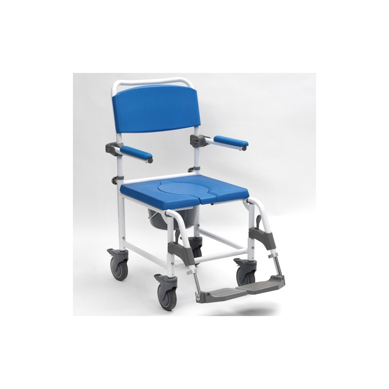 Mobilité : avec rouesAssise carrée avec découpe intimeAccoudoirs relevablesDossier avec poignée facilitant son déplacementRepose pieds amovibles et réglables en hauteurPoids maximal supporté : 130 kgPoids : 13,4 kgHauteur d'assise réglable : 48 à 53 cm