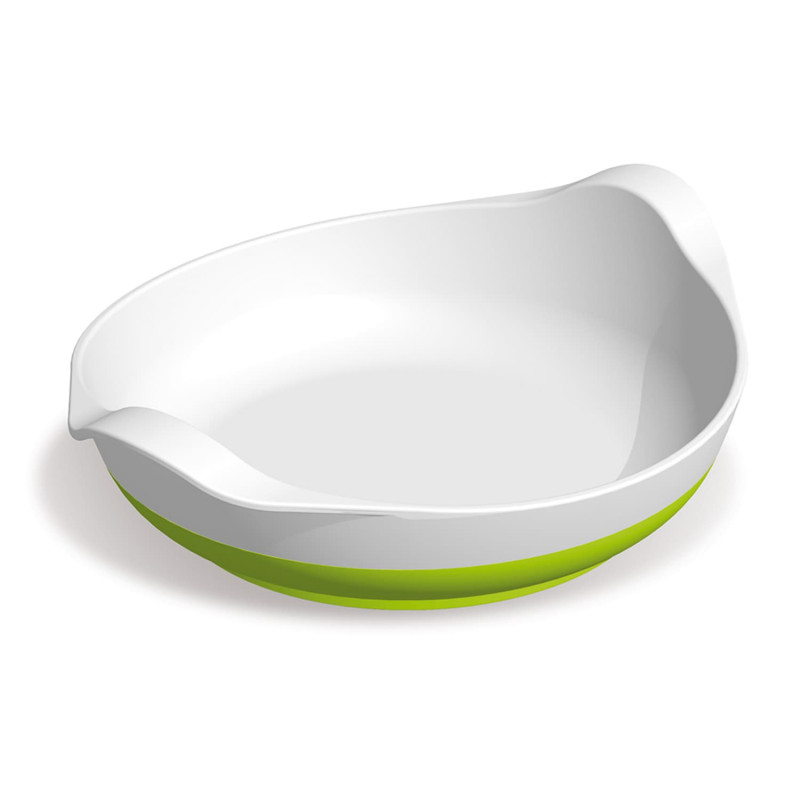 Base antidérapante. Oreilles creuses facilitants la préhension. Forme creuse pour faciliter la prise de repas.