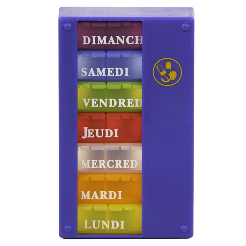 Triage hebdomadaire des comprimés21 compartiments (3 par jour)Couleur différente par jour